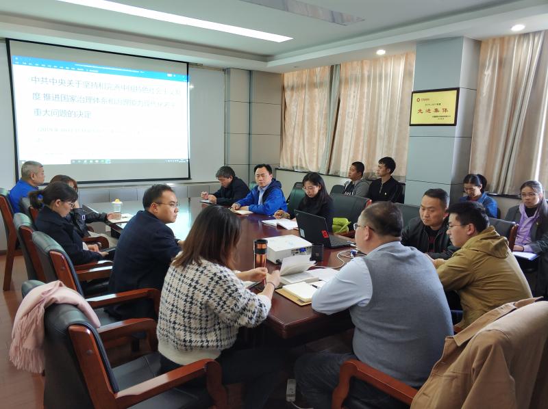 會議上,孫峻同志系統(tǒng)介紹了十九屆四中全會召開的詳細信息,帶領(lǐng)各位黨員重點學習《中共中央關(guān)于堅持和完善中國特色社會主義制度 推進國家治理體系和治理能力現(xiàn)代化若干重大問題的決定》和《習近平:關(guān)于〈中共中央關(guān)于堅持和完善中國特色社會主義制度推進國家治理體系和治理能力現(xiàn)代化若干重大問題的決定〉的說明》,并結(jié)合近期國內(nèi)外政治經(jīng)濟形勢及重大事件,詳細闡述了全會《決定》的具體內(nèi)容。